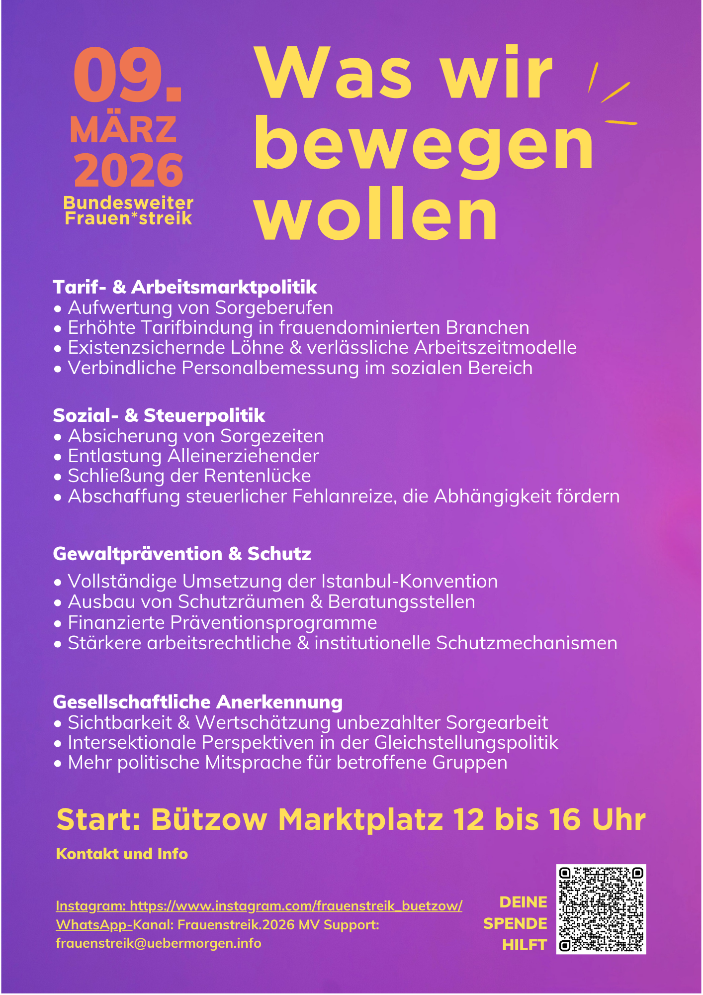 Kontakt und Infos frauenstreik@uebermorgen.info oder Flora Mennicken f.mennicken@hermannshagen.de